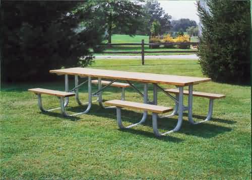 This traditional style wooden picnic table with classic planks for seats and table tops is high-quality, practical and comfortable for parks, recreation areas, or wherever an extra heavy-duty table is needed. These 10 foot outdoor wood tables are ADA approved, and are wheel-chair accessible from both sides with it's four separate seating areas. The extra heavy duty frame will stand up to heavy daily use and provide years of maintenance free use. Available in Untreated, Pressure Treated, and Redwood Stain wood finishes, Also Available with aluminum planks